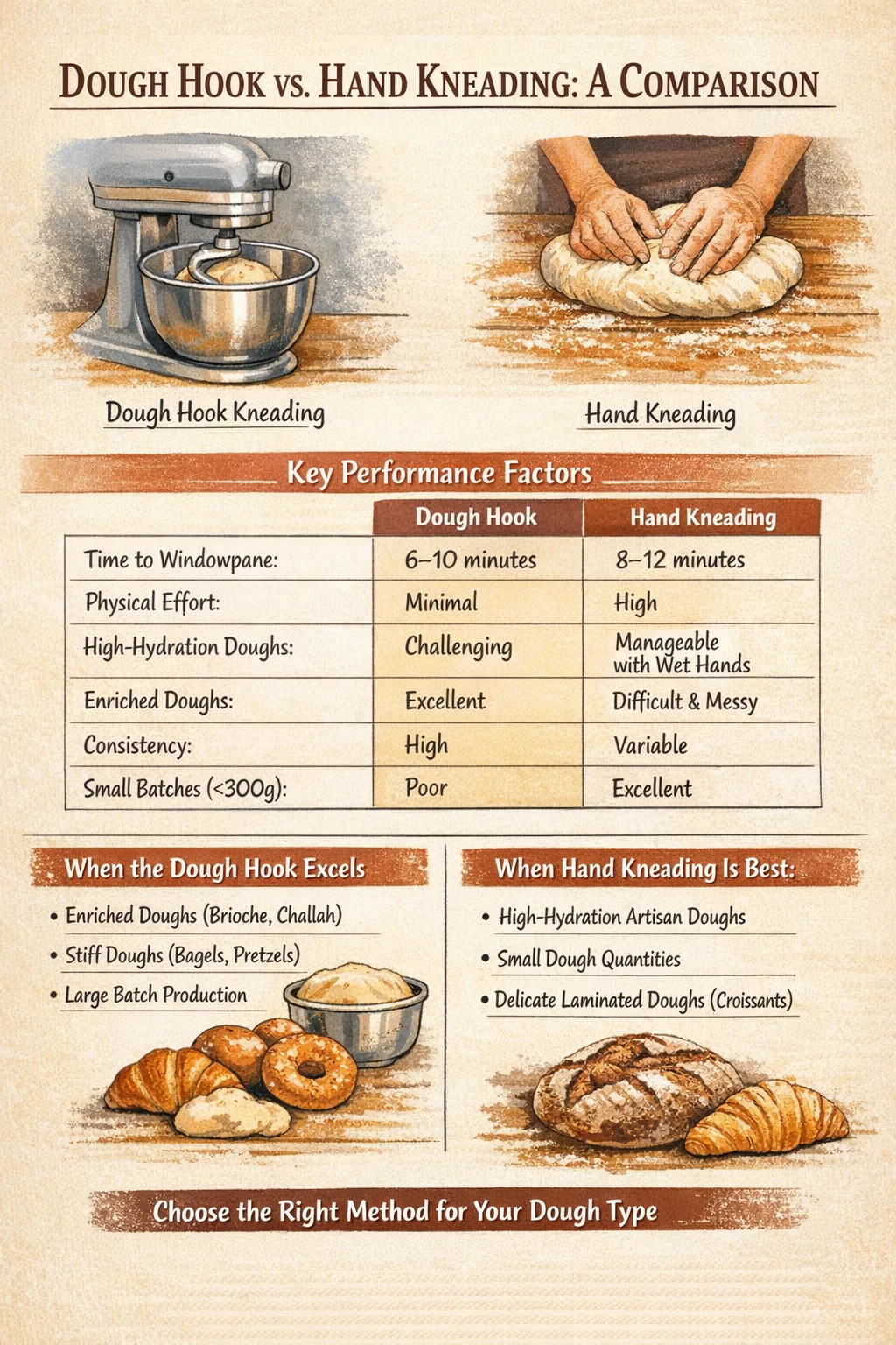 En degkrok är en pålitlig, praktisk ersättning för handknådning i de allra flesta scenarier för brödbakning. För vanliga bröddegar i 60 % till 72 % hydreringsområde , berikade degar, styva degar och produktion av stora partier, ger den likvärdiga eller överlägsna resultat med mycket mindre fysisk ansträngning. Nyckeln är att använda rätt hastighet, övervaka degtemperaturen och verifiera utvecklingen med fönsterrutetestet snarare än att enbart förlita sig på timing.