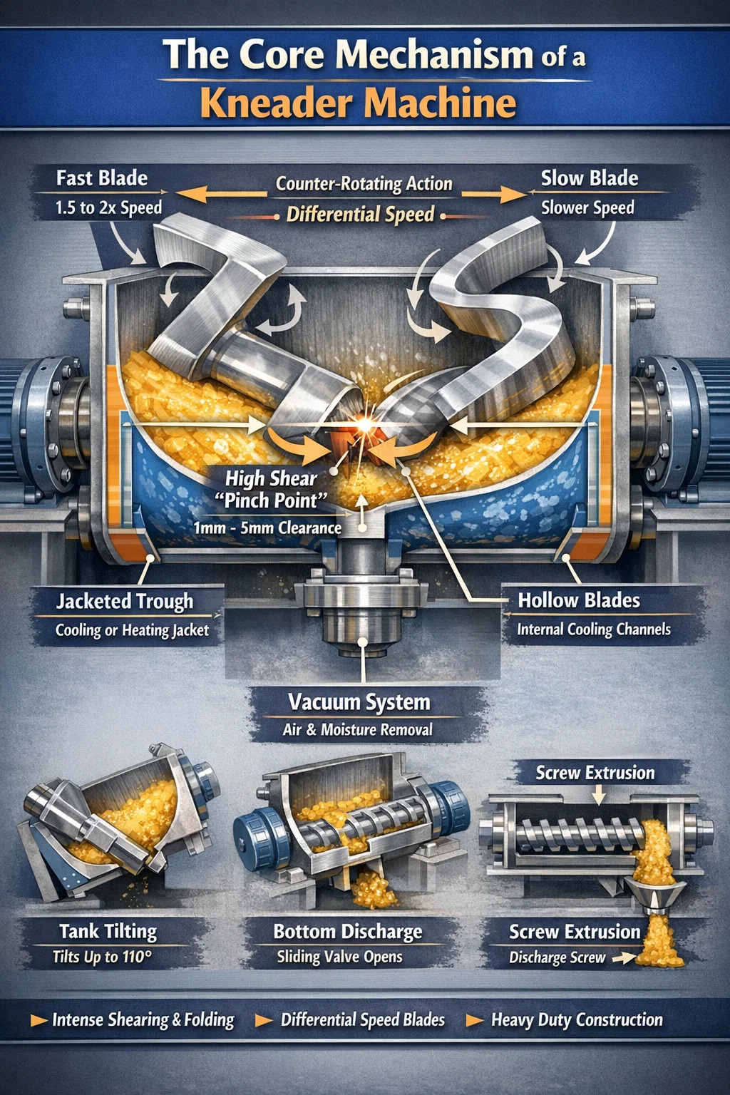 Hjärtat av knådarmaskin ligger i dess bladdynamik. De flesta industrienheter använder två horisontella axlar. Dessa axlar snurrar inte i samma takt; vanligtvis ett förhållande på 1,5:1 eller 2:1 appliceras mellan det "snabba" bladet och det "långsamma" bladet.