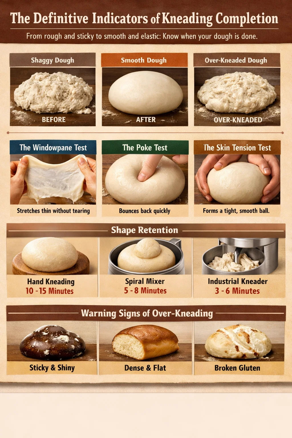 Istället för att förlita sig enbart på en timer, som kan vara felaktig på grund av fukt eller mjölproteininnehåll, använd dessa fysiska riktmärken för att verifiera tillståndet för din knådade material.