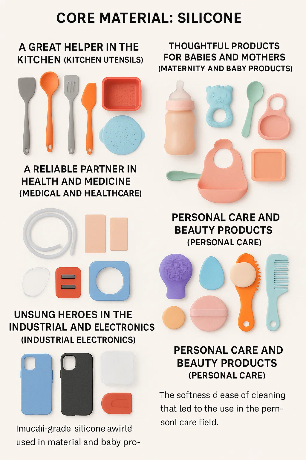 Silikonprodukter är olika föremål gjorda av ett speciellt material som kallas silikon. Det är inte samma sak som "kisel" som finns i elektroniska produkter. Här är en uppdelning av silikonprodukter: