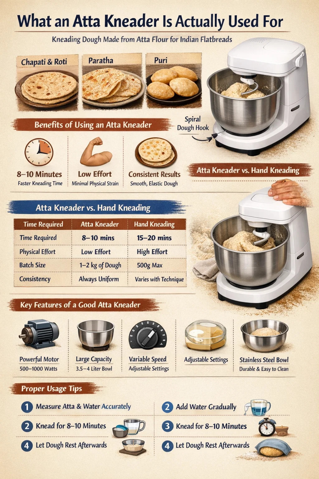 En atta-knådare är en köksapparat eller tillbehör som är speciellt utformad för att blanda och knåda deg gjord av atta-mjöl - hela vetemjölet som används som grunden för indiska tunnbröd som chapati, roti, paratha och puri. Maskinen replikerar viknings-, press- och sträckrörelserna vid handknådning och utvecklar glutentrådar i degen för att skapa den mjuka, smidiga konsistensen som behövs för tunnbröd som puffar jämnt och förblir möra efter tillagning.